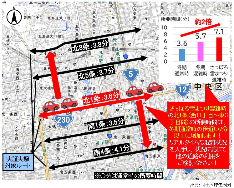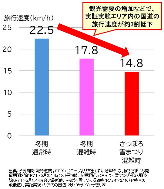 実証実験の札幌中心部(札幌駅周辺~すすきの周辺エリア)では、さっぽろ雪まつり開催時期に旅行速度が大きく低下しているんだね!