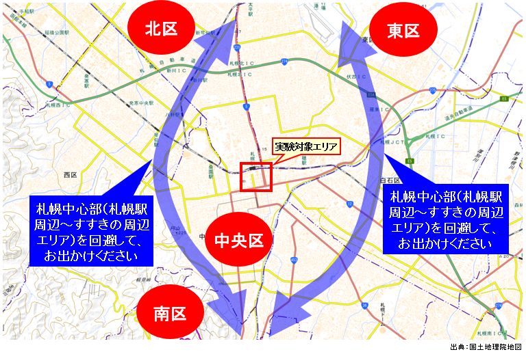 北区・東区方面~中央区・南区方面を行き来する人は、実験対象エリアの札幌中心部(札幌駅周辺~すすきの周辺エリア)を通過するだけの人が多いんだ!